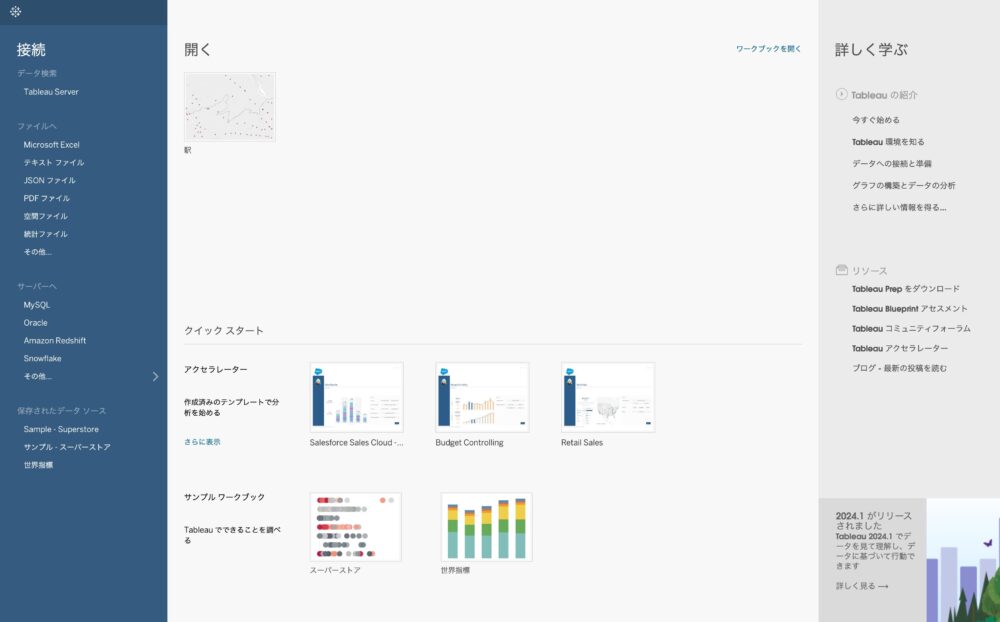 まずは、コンピュータにTableau Desktopをインストールして起動します。Tableau Desktopを起動すると、新しいワークブックを作成する画面が表示されます。